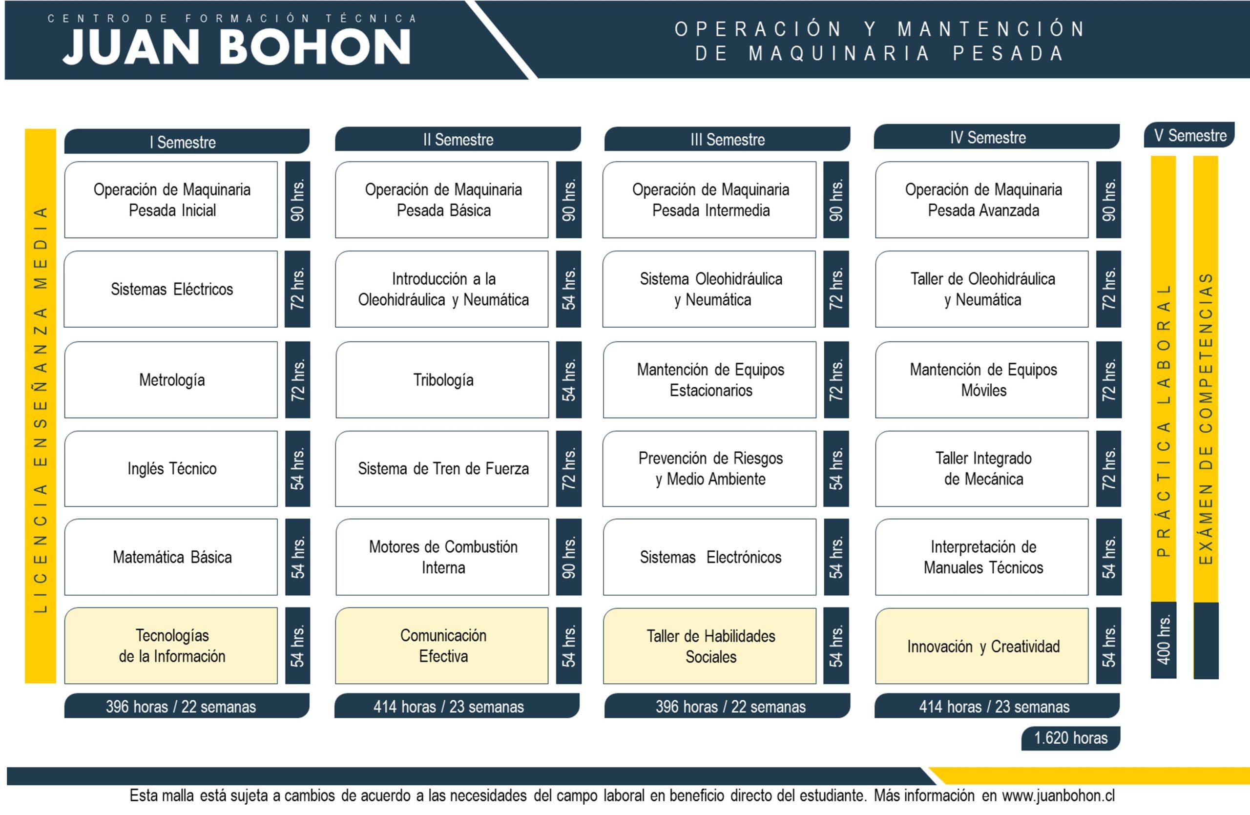 El/la Técnico de Nivel Superior en Operación y Mantención de Maquinaria Pesada del Centro de Formación Técnica Juan Bohon, está capacitado para operar de manera segura y efectiva, maquinaria de equipo pesado, proporcionando servicios de mantención, mantenimiento y chequeos, de la maquinaria como de sus componentes, sean estos preventivos, correctivos y predictivos, disminuyendo los tiempos de parada e incrementando la disponibilidad de la maquinaria, de acuerdo con los requerimientos técnicos y procedimientos establecidos. Se podrá desempeñar en el área de construcción, obras civiles, minería y otras, comprometidos con el cumplimiento de protocolos y normas de seguridad.